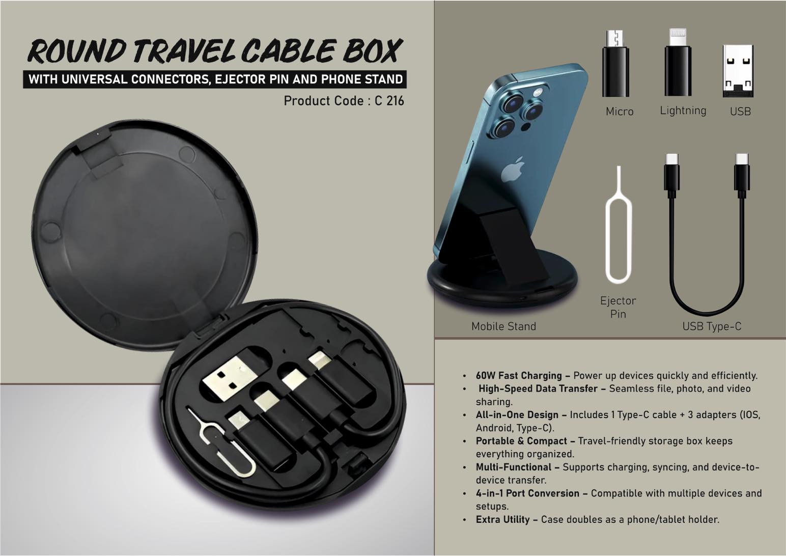 – All-in-One Design: Includes 1 Type-C cable + 3 adapters (IOS, Android, Type-C)