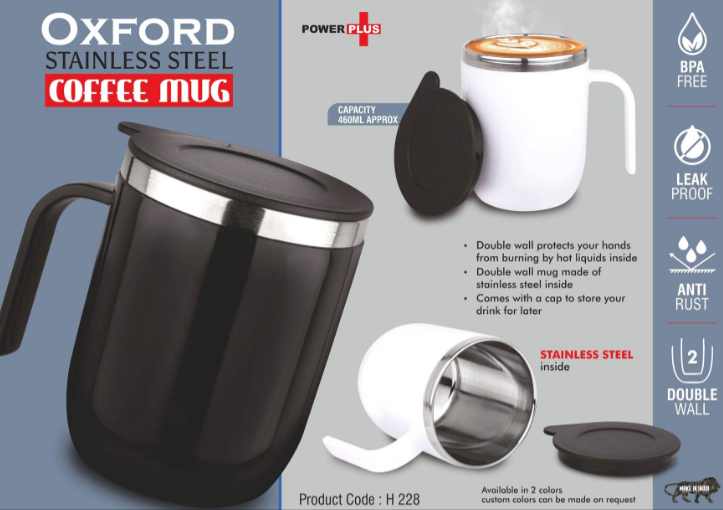 H228 – Oxford: Stainless Steel Double wall Coffee mug with Round handle | Leakproof | Capacity 460ml approxH228 – Oxford: Stainless Steel Double wall Coffee mug with Round handle | Leakproof | Capacity 460ml approx
