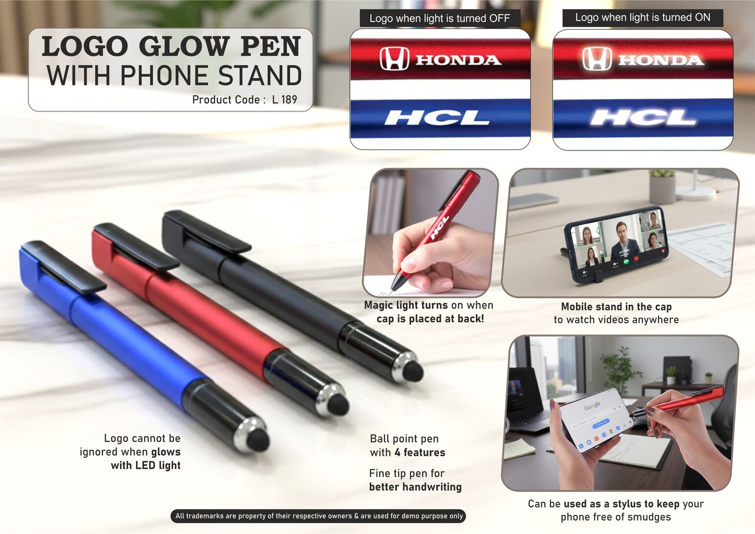 – Functions as a ball pen, stylus, phone stand, and LED branding tool