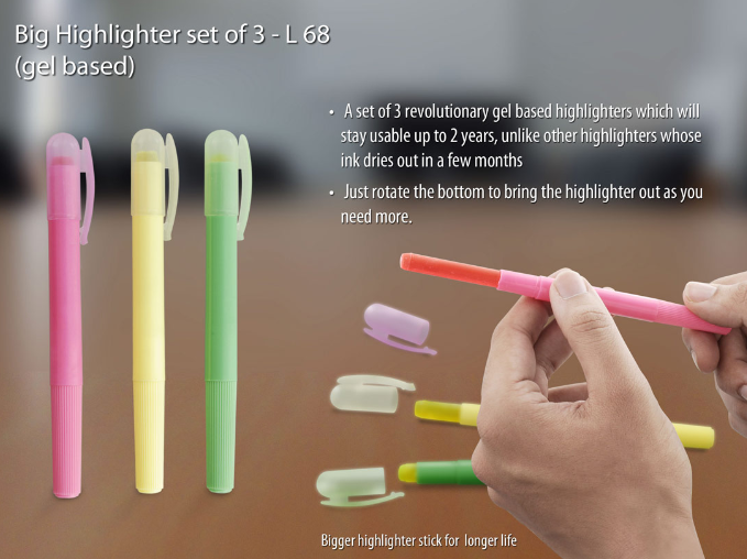 – A set of 3 revolutionery gel based highlighters which will stay usable upto 2 years, unlike other highlighters whose ink dries out in a few months