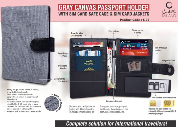 S37 – Gray Canvas Passport holder with Sim Card Safe Case & Sim Card Jackets